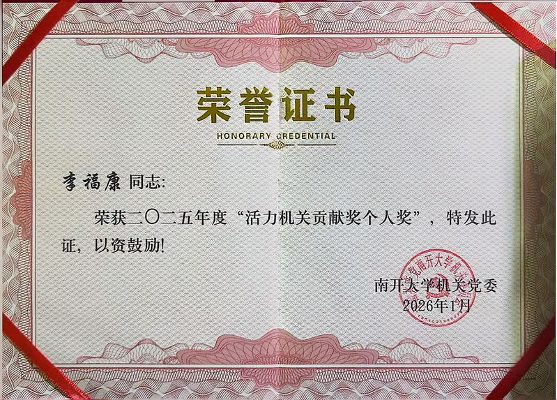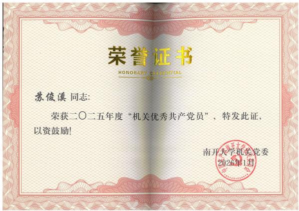 个人荣誉中,苏俊溪同志牢记党员使命,充分发挥先锋模范作用,在党建引领业务开展、攻坚克难完成重点任务中走在前、作表率,荣获“机关优秀共产党员”称号;王彬同志立足岗位、竭诚服务,以高效务实的工作作风、细致严谨的服务态度,荣获“机关服务标兵”称号;李福康同志积极投身机关文化建设,主动参与各类集体活动,以饱满热情为机关注入活力,获得“活力机关贡献奖-个人奖”荣誉。