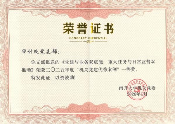 集体荣誉中,审计处党支部荣获“机关先进党支部”称号,机关党委共5个支部获评该项荣誉。同时,支部报送的“党建与业务双赋能,重大任务与日常监督双推动”党建案例,荣获“机关党建优秀案例一等奖”。